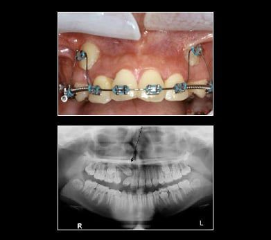 Ectopic canines are generally found in the Buccal Vestibule. Impacted canines may be retrieved with braces, using a surgical approach via a gold chain or straight wire. Tissue covering the tooth is uncovered. A chain or wire is attached to the tooth crown. Tissue is placed back over the tooth leaving the chain or wire coming out of the gum. For the purpose of this illustration a gold chain is used to retrieve the canines. The chain is attached to the tooth crown and the link is attached to a flexible archwire so that the wire is active (bent). Once a month, the wire is reactivated by using the next link up on the chain until the impacted canine erupts enough to attach a regular bracket on the canine. With the regular bracket in place, a more flexible wire is added directly to the bracketed canine. This process will bring the canine into position within the arch by forcing the canine to conform to the straight archwire form. This is a long process taking anywhere from 8-12 months.